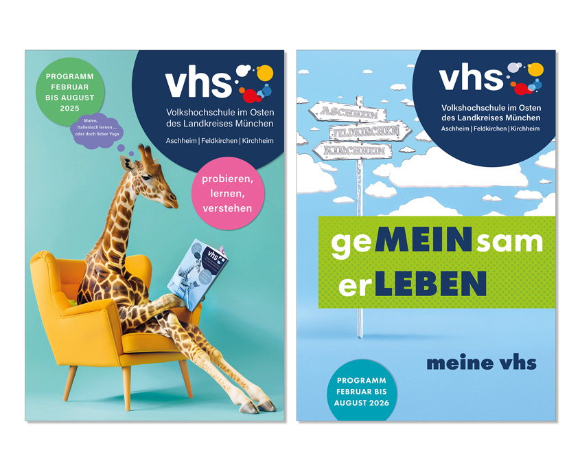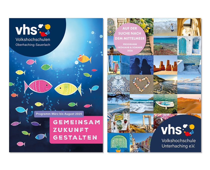Wir erstellen die Semesterprogramme für die diverse Volkshochschulen im Süden und Osten des Landkreises München u.a. vhs Unterhaching, vhs Oberhaching-Sauerlach, vhs Taufkirchen sowie für die die Volkshochschulen Aschheim, Feldkirchen und Kirchheim.